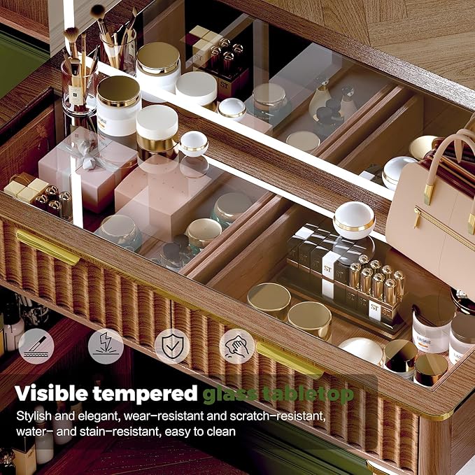 - 【Modern and Stylish Design】 Featuring a premium glass top to display your cosmetics elegantly, spacious display cabinet for organization, oversized mirror for flawless application, and angled drawers for modern appeal – all crafted with high-end materials for lasting style and durability.