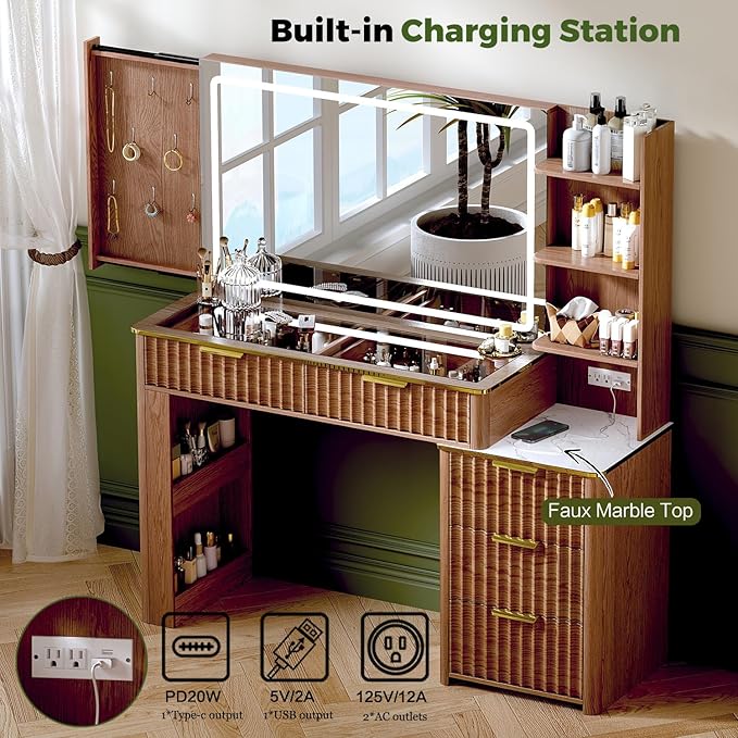 - 【Built-in Power Strip】Upgrade design!This makeup table equipped with a power strip that has 2 standard plug sockets ,1 USB ports and 1 T-C with a 4.9-foot power cord,convenient for the LED lights,hairdryer, curling iron, and charge your phone, tablet, or other electronics.