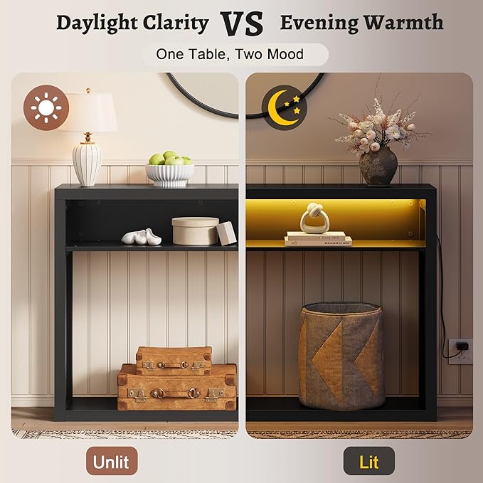 FAVOOSTY 47.2" Farmhouse Console Table with Storage, Entryway Console Table with Led Light, 2-Tier Entryway Table Sofa Table Behind Couch Table Hallway Stand for Living Room,Foyer,Entrance Black
