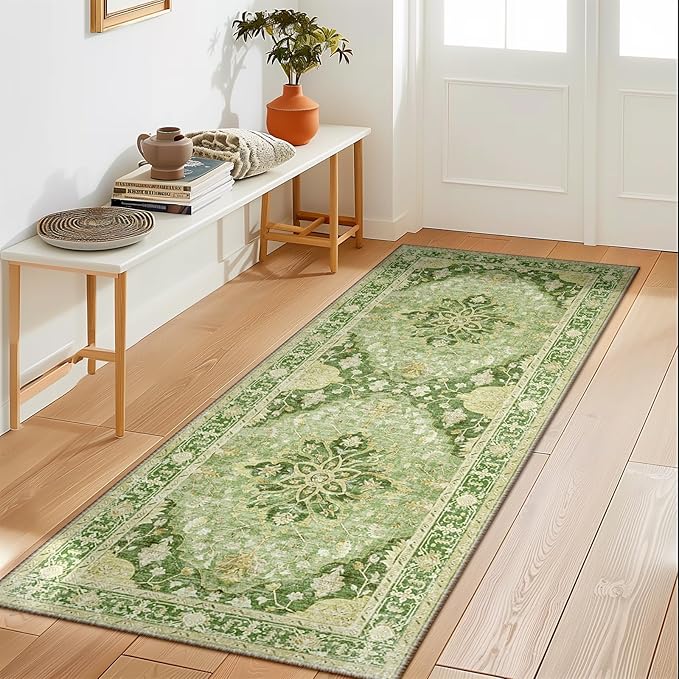 Area Rugs 2'x6' Washable Non-Slip, Floral Vintage Distress Print Pattern Medallion Carpet for Living Room Bedroom Dining Room, Sage Green Yellow