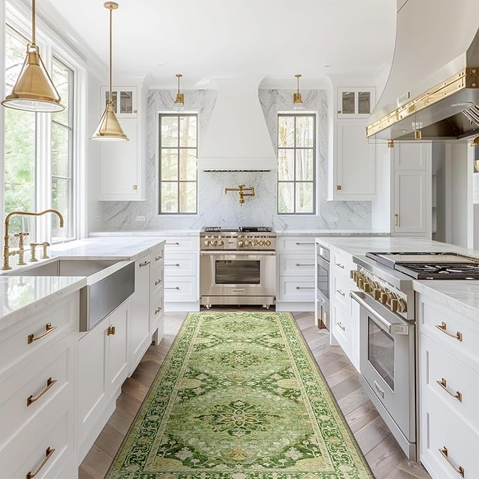 Area Rugs 2'x8' Washable Non-Slip, Floral Vintage Distress Print Pattern Medallion Carpet for Living Room Bedroom Dining Room, Sage Green Yellow