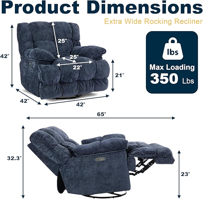 - OVERSIZED RECLINER CHAIR - Luxuriously padded and upholstered with premium. Indulge in plush comfort with GINGO power oversized recliner chair, boasting expansive dimensions of 42"W x 42"D x 42"H, with a generous seat measuring 25"D x 22"W. When fully reclined, it offers a bed-like appearance.