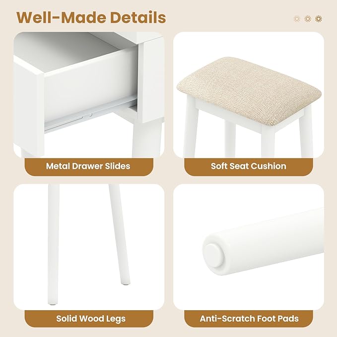 - [Durable Construction Built to Last]: Crafted with solid wood legs, smooth metal drawer slides, and anti-scratch foot pads, this vanity set offers long-lasting stability. The stool’s padded seat adds extra comfort for everyday use.