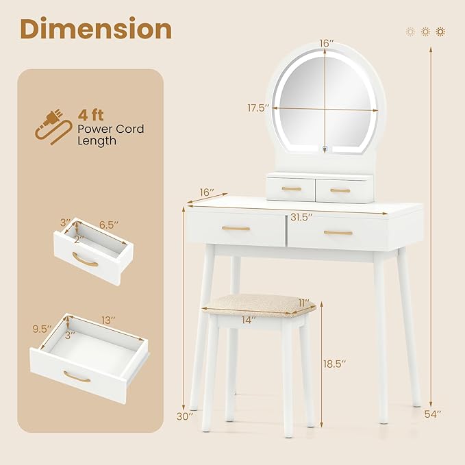 - [Compact Size with Full Functionality]: Measuring 31.5" x 16" x 54", this vanity table is ideal for small bedrooms, apartments, or dorm rooms. Comes with a cushioned stool to complete your daily beauty routine in comfort and style.