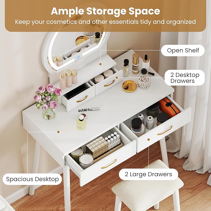 - [Smart Storage for All Your Beauty Essentials]: Stay organized with 2 compact desktop drawers, 2 spacious lower drawers, and an open shelf—perfect for storing everything from jewelry and makeup to hair tools and skincare products.