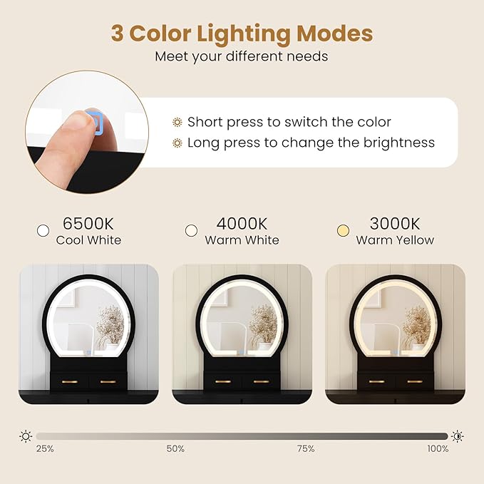 - [Adjustable LED Mirror for Flawless Makeup]: The vanity mirror features 3 color lighting modes—cool white (6500K), natural white (4000K), and warm yellow (3000K)—along with stepless brightness control from 25% to 100%. Achieve perfect makeup under any lighting condition with just a simple touch.