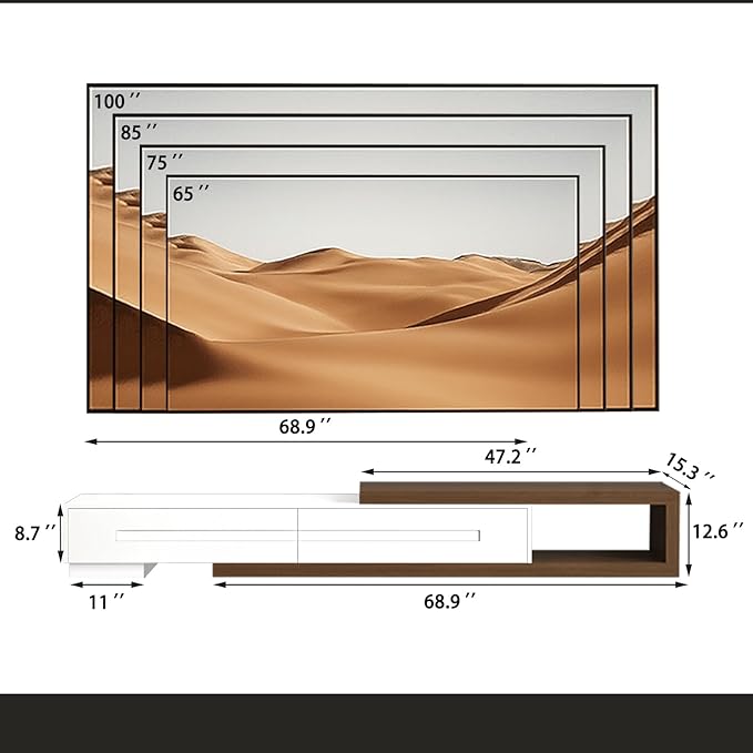 - Extendable Design:Length from 80.6" to 115.2", fits different TV sizes and room layouts. Modern look for any home. The sturdy build can support most flat-screen TVs up to 120 inches
