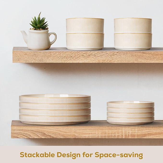 Romswi Ceramic 18Pcs Dinnerware Sets,Stoneware Plates and Bowls Set for 6, Chip & Scratch Resistant Ribbed Dish Set, Handmade Reactive Glaze, Oven, Microwave & Dishwasher Safe, Cappuccino White