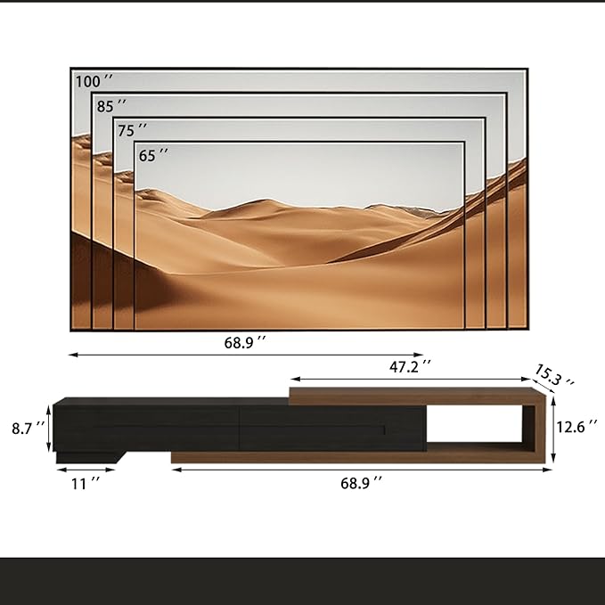 - Extendable Design:Length from 80.6" to 115.2", fits different TV sizes and room layouts. Modern look for any home. The sturdy build can support most flat-screen TVs up to 120 inches