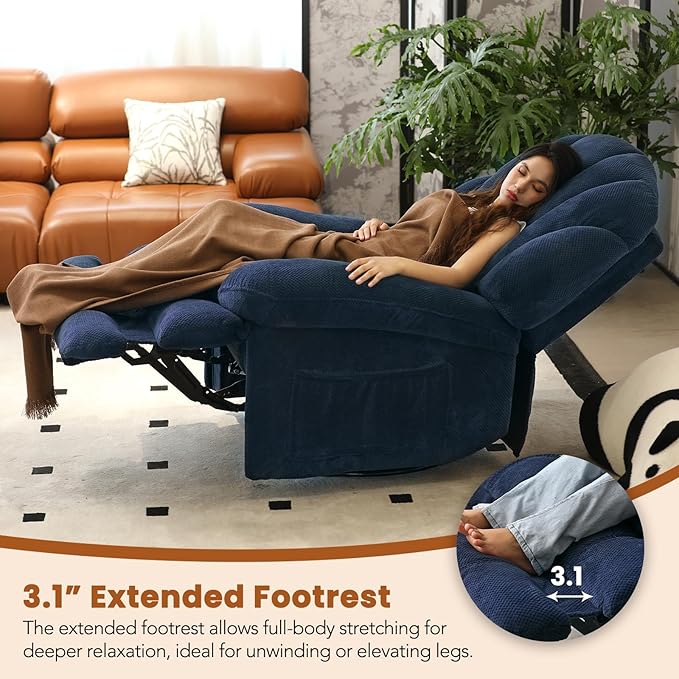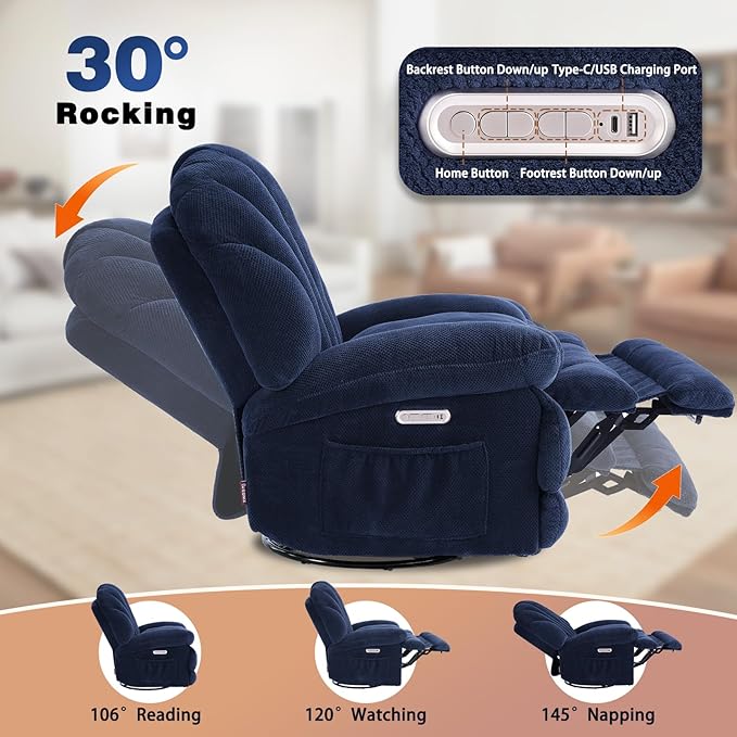 EONIX Oversized Power Swivel Rocker Recliner Chair for Living Room, Power Adjustable Backrest and Extended Footrest, USB Charging Ports, SXXY004021, Navy Blue