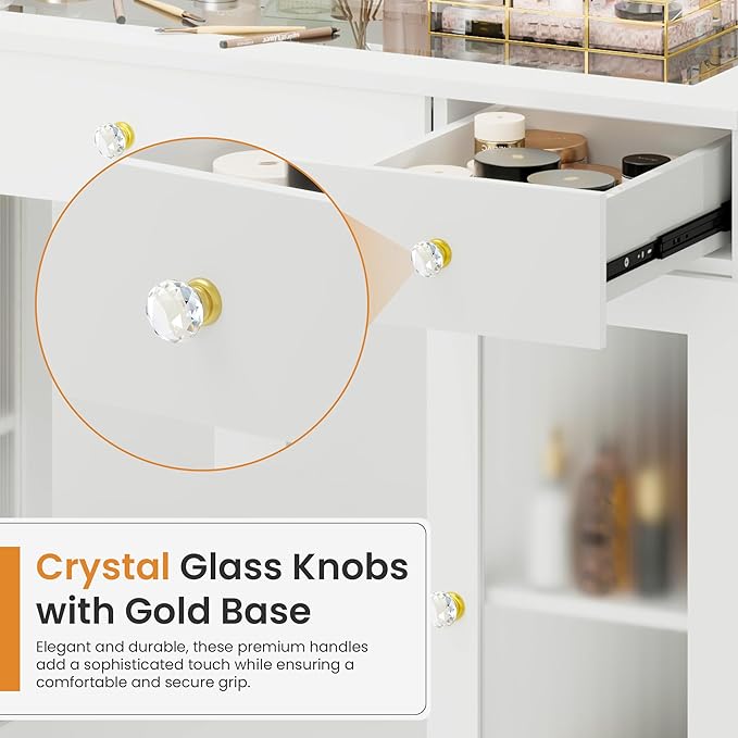 - Stylish Storage Design: With 3 organized drawers, 2 cabinets in transparent design, tempered glass tabletop, and crystal handles, this makeup desk is perfect for organizing your makeup essentials, perfumes, jewelry, and more. Product Size: 43.3"*15.7"*57"; Mirror Size: 43.3"*26.6";Tabletop Height: 30.3". The transparent storage cabinet and the exquisite crystal ball knob adds a luxurious and elegant touch for room