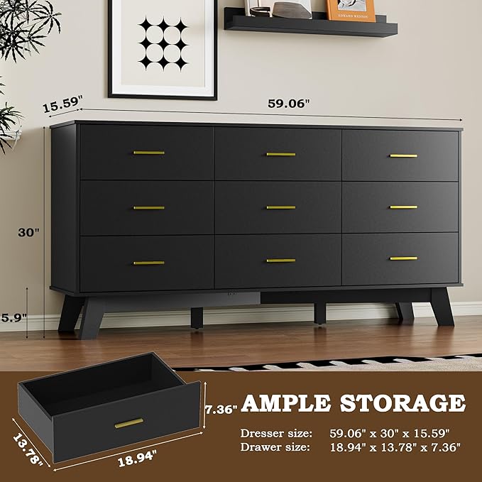 - Spacious Storage with Practical Dimensions: Maximize your storage potential with BORNOON 9-drawer dresser, measuring 15.59" D x 59.06" W x 30" H. Each drawer—sized 13.78" D x 18.94" W x 7.36" H—offers ample space to neatly store clothing, accessories, and everyday essentials. With nine evenly sized drawers, you get a perfect blend of organization and accessibility.