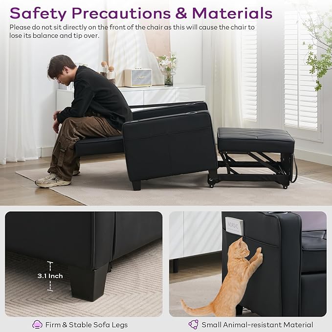 - Office-Ready & Pet-Friendly Comfort: This chair bed features a sleek faux leather surface that resists scratches from curious paws—perfect if you’ve got a cat that loves to explore. The smooth material is also easy to clean, making it an ideal fit for your office, study, or guest room. Stuffed with high-density foam and supported by a sturdy solid wood frame, it offers superior support up to 450 lbs—much quieter and more stable than typical metal structures. Chair size: 30.7"W x 33.8"D x 33.1"H; Bed Size: 30.7"W x 68.31"D x 15.9"H
