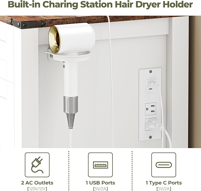 - Built-in Charging Station: Makeup vanity is equipped with a multi-functional charging station, including 2 standard sockets, 1 USB port and 1 Type-C port, and uses a 4.9-foot extended power cord for flexible placement. Built-in safety protection devices ensure that multiple devices are charged safely at the same time. In addition, our vanity also comes with a hair dryer rack for easy access to the hair dryer.