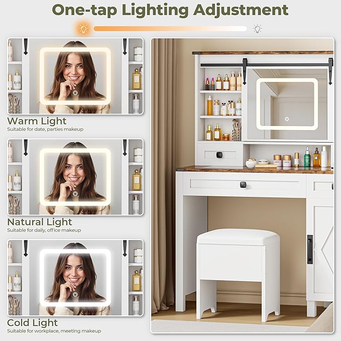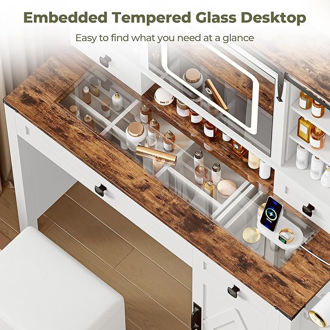 IRONCK Farmhouse Vanity Desk with Sliding Mirror & Lights, Glass Top Makeup Vanity Table with Power Outlet, 3 Color Lighting Modes, 4 Drawers & Storage Cabinet, Includes Cushioned Stool for Bedroom