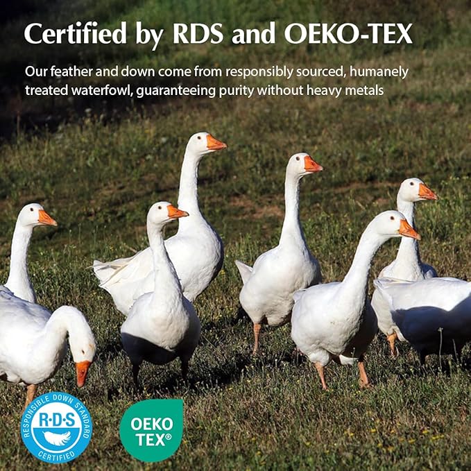 - Ethically Sourced: We commit to sustainable sourcing and minimal packaging to reduce our carbon footprint. Certified by RDS and OEKO-TEX Standard 100, our premium white goose down pillows guarantee ethical sourcing, safety, and free from heavy metals. A thoughtful choice for your well-being and the planet.