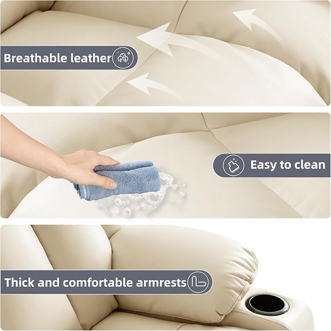 Power Lift Recliner Chair for Elderly, Electric Recliner Chairs for Adults with Massage and Heat, Cup Holders, Remote Control, USB Ports, Side Pockets, Leather (Cream)