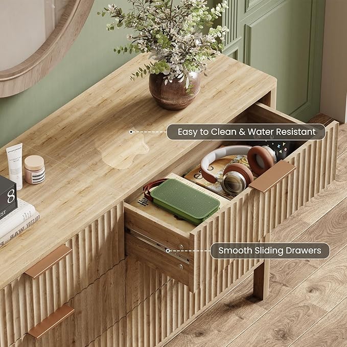 - Waterproof & Easy to Clean Tabletop: The tabletop of this bedroom dresser is waterproof, so you don't have to worry about spills and stains. Simply wipe it with a damp cloth and it will stay clean as new. This dresser for bedroom features a fluted top design that adds a touch of elegance to dressers. You may find that this wood dresser has some color difference in different light, which is normal. Because this is the natural beauty of wood, which gives it its unique charm.