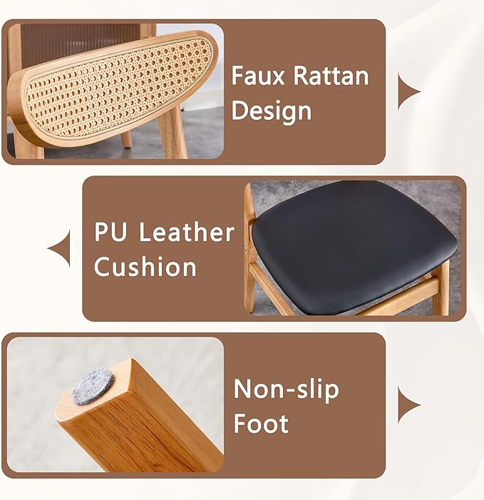 - Comfortable Rattan-Back Chairs:Each solid wood dining chair has a faux rattan back and padded PU leather seat for support and comfort. Ideal for breakfast nook, kitchen table set, or apartment dining setup