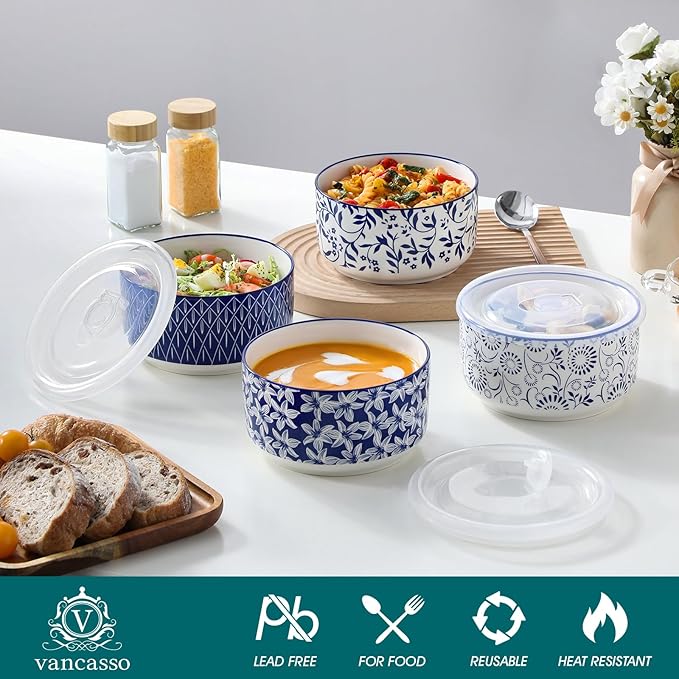 vancasso 36 Oz Mixing Bowls with Lids Set of 4,Ceramic Serving Bowls,Porcelain Bowls with Lids for Food Storage, Mixing Bowls for Kitchen, Microwave & Dishwasher Safe,Series SELENE (4PCS)