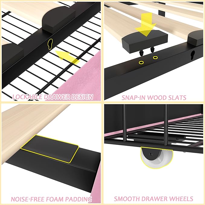 - [Stylish Bed Frame with 4 Storage Drawers] – Maximize your space with this full bed frame featuring four spacious storage drawers, complete with easy-glide wheels for effortless access. Each drawer (37.5’’L x 16.9’’W x 9.4’’H) offers ample room for seasonal bedding, clothing, toys, and more, keeping your bedroom organized and clutter-free.