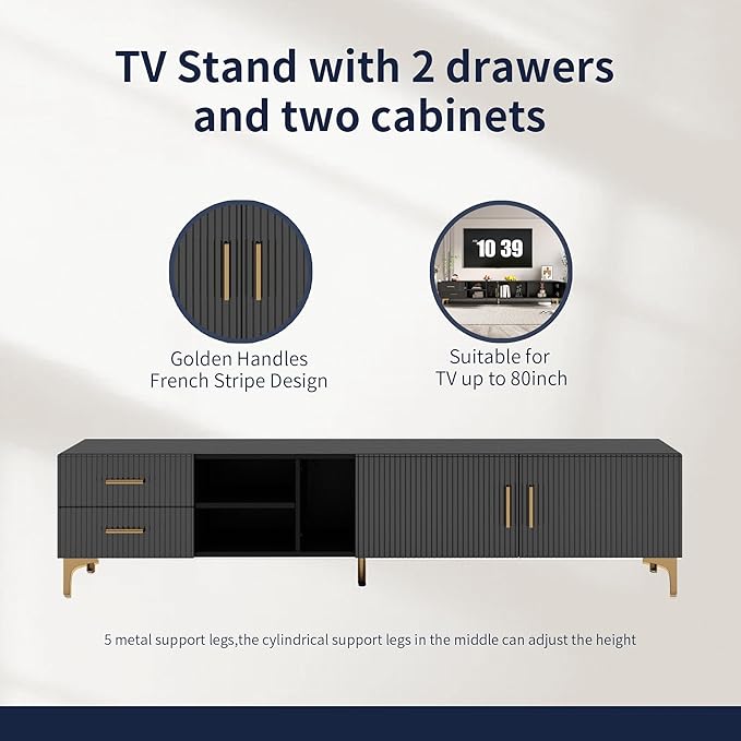 - Ample Storage Options:This tv console includes two spacious drawers for versatile storage. The durable design keeps belongings dust-free while offering reliable support for your entertainment devices. With a generous 71-inch long, it comfortably accommodates TVs up to 80 inches.
