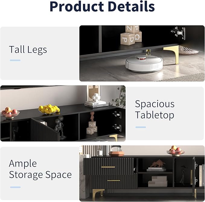 - Sleek and Modern TV cabinet combination:With clean lines and a minimalist aesthetic that will complement any décor. The TV console with side cabinets, allowing you to customize the storage to fit your specific needs. Whether you need to store DVDs, CDs, or even books, these shelves can be adjusted to accommodate your collection.