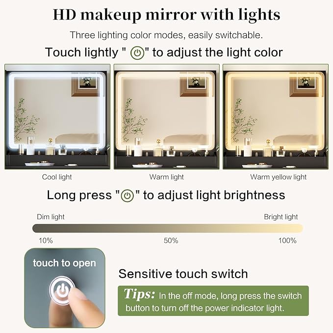 - 【3-Color LED Light】The vanity desk has a large dimmable lighting mirror with 3 different LED lighting colors, including natural, warm and cool light, for a variety of indoor lighting and environments to optimize your makeup
