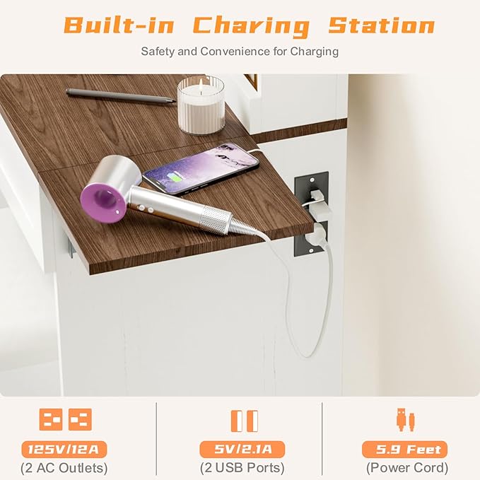 - 【Convenient and Practical】The bedroom dresser comes with 2 AC outlets, 2 USB ports and an adjustable hair dryer stand, allowing you to easily use your hair dryer or curling iron and charge your phone, tablet and other electronic devices while sitting in front of the dresser.