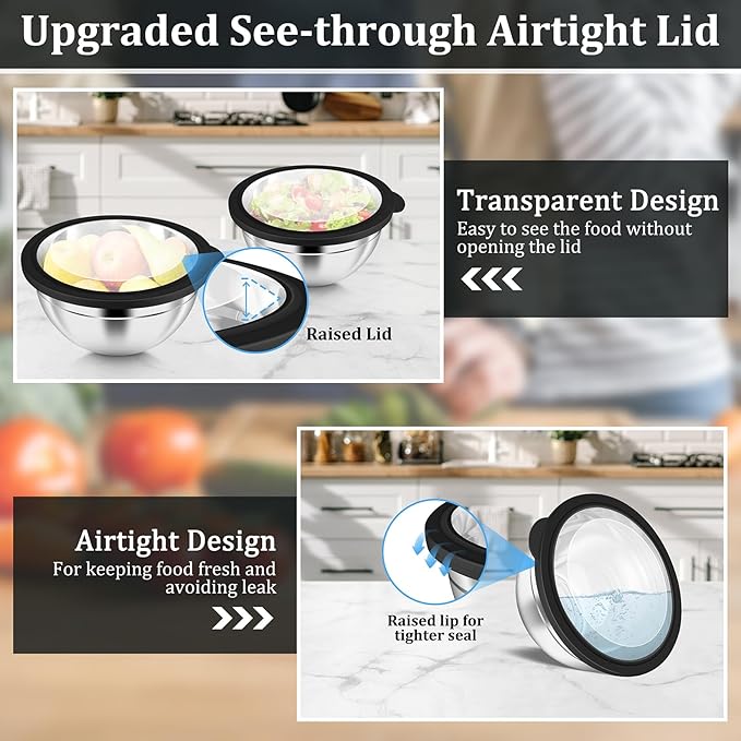 - 【Upgrade Visible Airtight Lid】 Each metal mixing bowl comes with a visible lid, Allows you to easily see the contents without opening it, The lid silicone side is completely wrapped around the bowl and not warp easily, Keep your food fresh and avoid food spilling and leaking, Raised lid design to provide more capacity for food storage and will not squeeze foods, And the protruding handle makes the lid easier to open