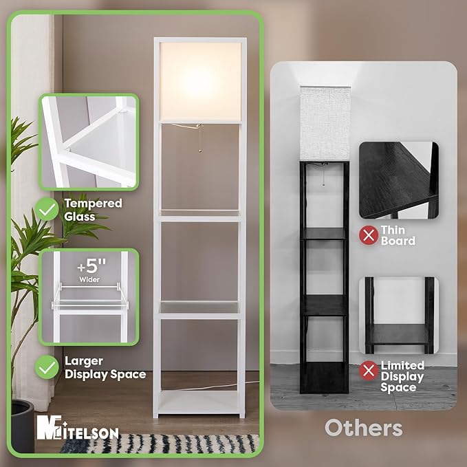 - ✔Multi-Purpose Display: This isn’t just a floor lamp—it’s a multi-purpose shelf too. Use it to display your favorite books, children’s toys, photo albums, or decorative items to show off to friends and family. With its upgraded sturdy frame and glass shelves, it’s strong, stable and holds more items than ever. Place it next to your bed, desk, sofa, or TV stand—it will fit right in anywhere in your home.