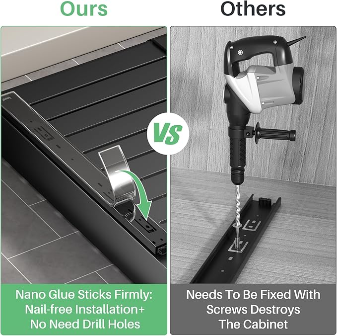 - NO NEED DRILL & NAIL: The kitchen cabinet organizers and storage contains detailed instructions, easy to install, no need to drill & nail and just following manual, you could finish the installation in 10S. Perfect for your kitchen, bathroom, under sink and pantry storage organizing.