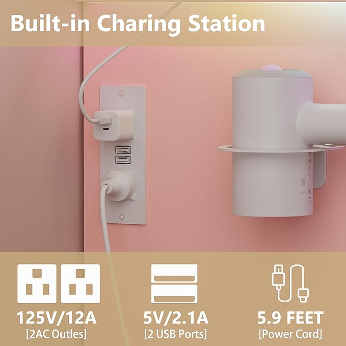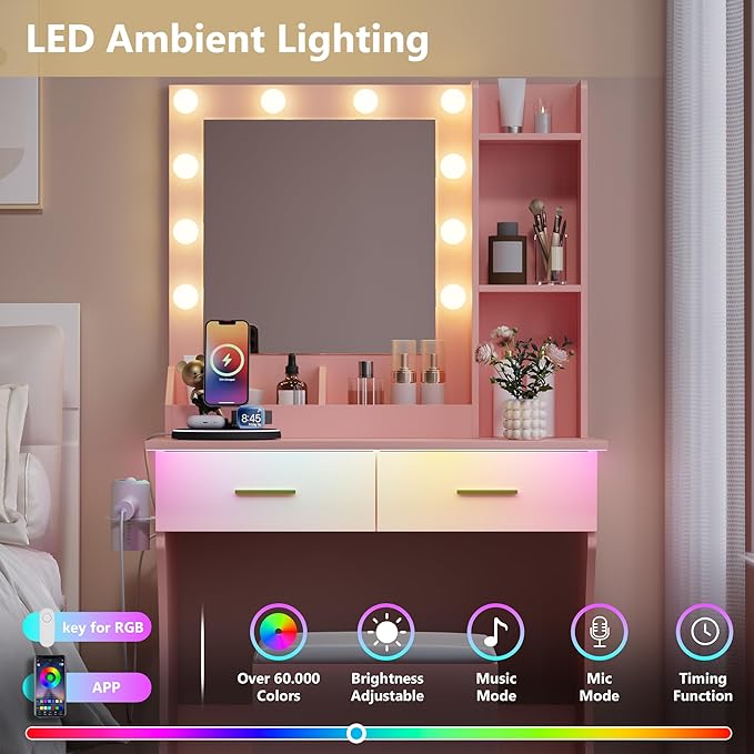 - Vanity Desk with RGB Lighting and Power Outlets: Add color to your routine with 60,000+ RGB lighting modes that sync with music. This vanity with power outlet and USB includes a built-in station with 2 AC outlets and 2 USB ports—perfect for powering hair tools or charging your phone while you get ready.