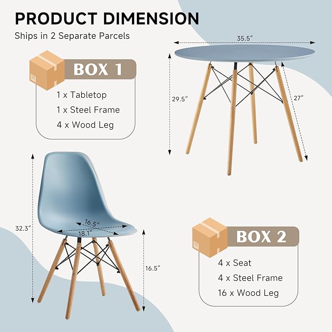 35.5'' 5 Piece Round Dining Table Set for 4, Mid-Century Modern Table with Chairs, Space Saving, Plastic Seats, Wood Legs, Circle Dinner Table for Kitchen, Home, Apartment, Blue