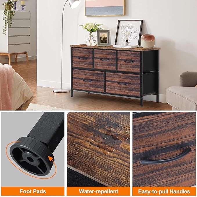 Dresser for Bedroom with 5 Drawers, Chest of Drawers, Storage Drawers Organizer Unit, Black Wide Fabric Dresser with Fabric Bins for Closet, Living Room, Bedroom (Brown and Rustic Brown)