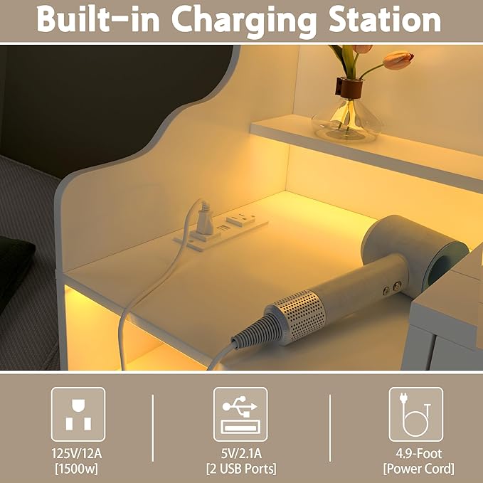 - Built-in Charging Station: This makeup vanity adds 2 standard plug sockets, 2 USB ports and 4.92 feet power cord that can be easily connected to the power supply. Make it convenient for you to use hair dryers, curling irons, beauty devices and charge.