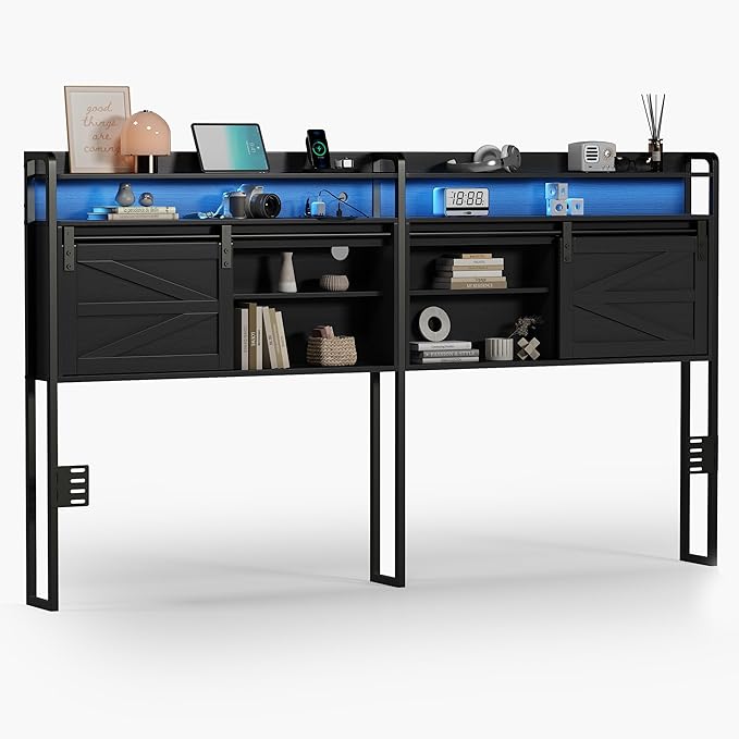 wanan Headboard King Size with Storage, 3 Tier Size Headboard only with Outlets, USB Ports and LED Light Strip, Headboards with Sliding Barn Doors, Adjustable Shelf (Black, King (U.S. Standard))