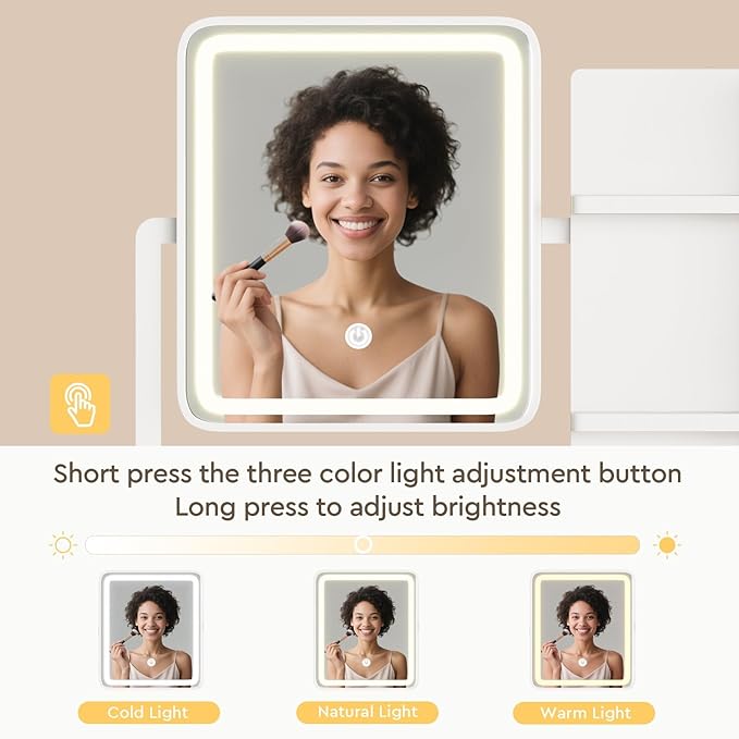 - Makeup Vanity Desk with Lights: Our makeup vanity desk comes with LED lighted mirror featuring 3 modes (warm, natural, and cool). You can adjust the brightness for different environments and makeup needs by long-pressing the screen.