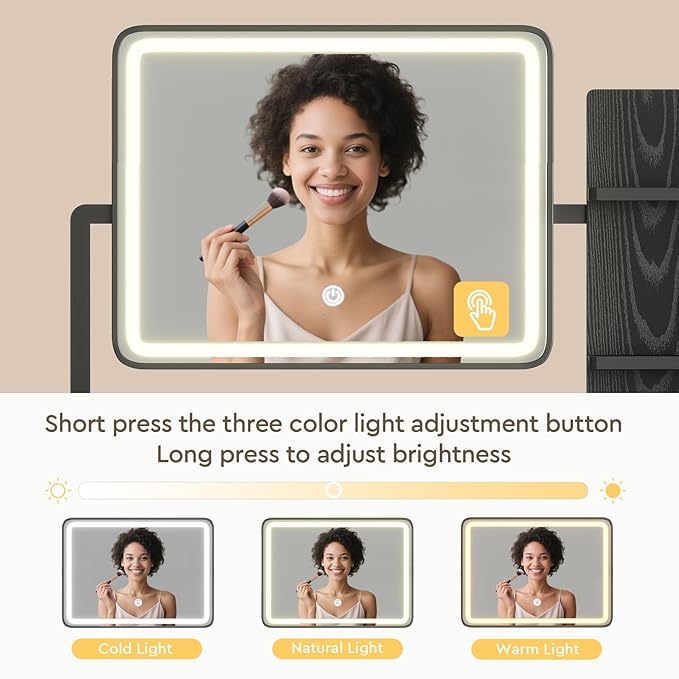 - Makeup Vanity Desk with Lights: Our makeup vanity desk comes with LED lighted mirror featuring 3 modes (warm, natural, and cool). You can adjust the brightness for different environments and makeup needs by long-pressing the screen.