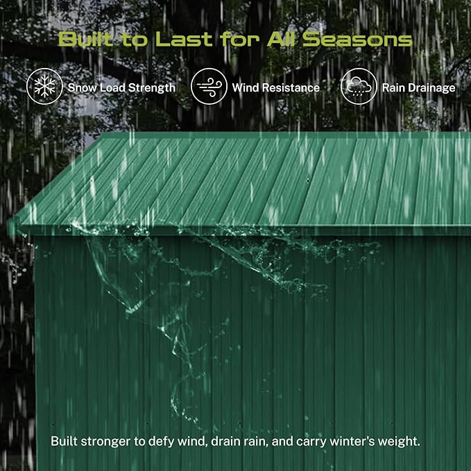 - 【Ultra-Durable for Harsh Climates】Constructed with 24/34-gauge galvanized steel, this weatherproof garden shed resists rust, 6 Beaufort winds (24-30mph), and heavy snow, ensuring a 10-year lifespan in coastal or snowy regions