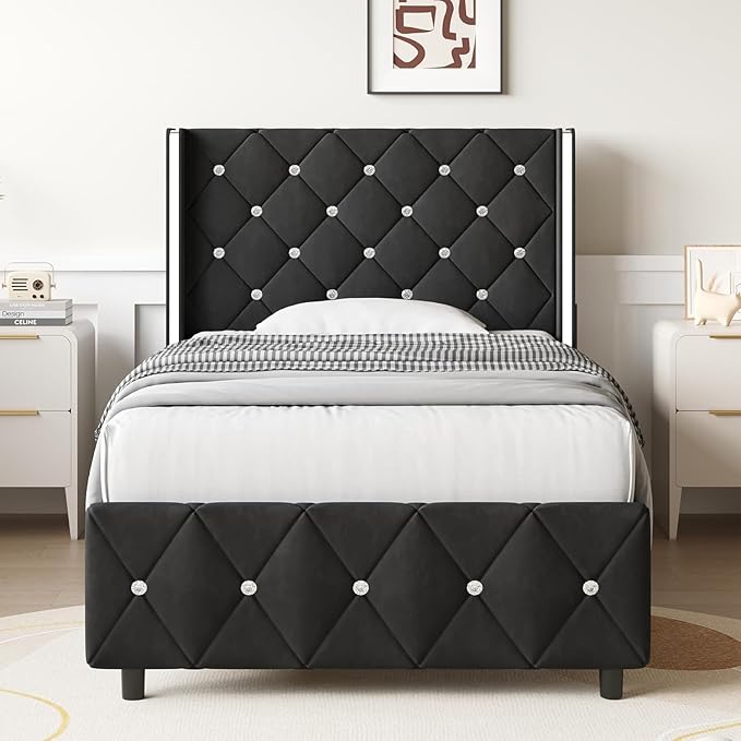Twin Bed Frames, Upholstered Platform Bed Twin Size with Diamond Tufted Headboard, Modern Velvet Bed Frame with Wingback Design, No Box Spring Needed, Easy Assembly, Black