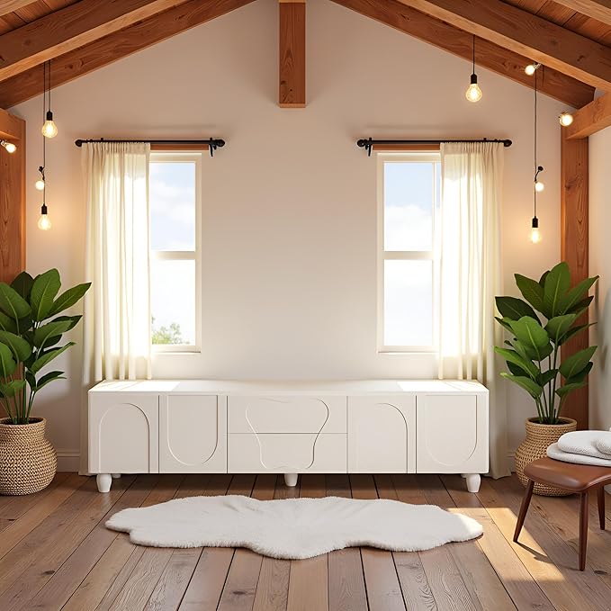 - 【Modern Wood TV Stand】: Crafted from high-grade MDF wood, this contemporary TV stand features unique arch doors, cylindrical legs, and a sleek handle-free rebound design for clean lines.