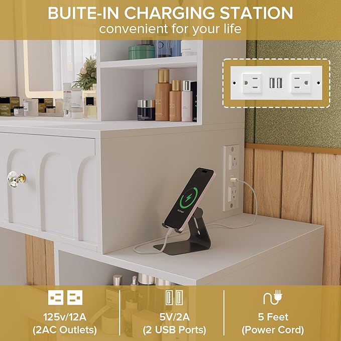 - 【Convenient Built-in Power Outlets & USB Ports】Stay connected while getting ready. The vanity desk with drawers and lights includes 2 standard AC outlets, 2 USB ports, and a 5-foot power cord—perfect for charging your phone, using a hairdryer, or powering curling irons without moving from your seat.