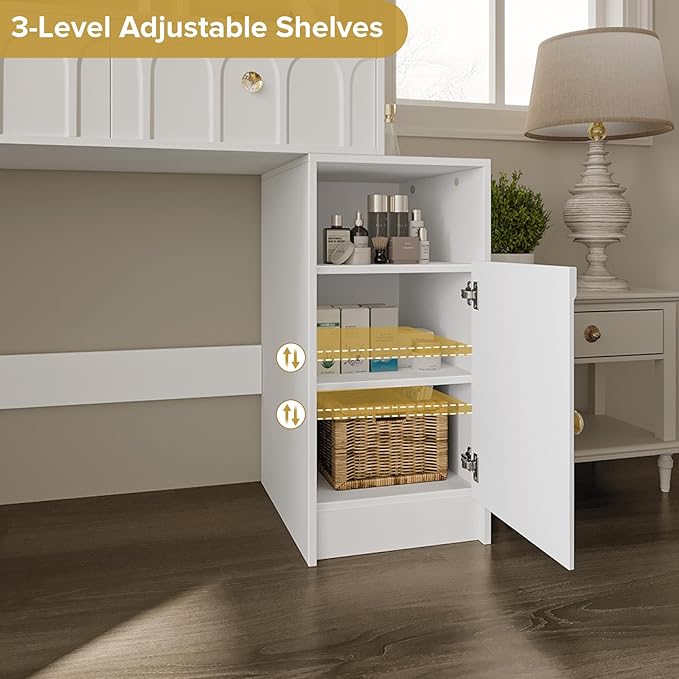 - 【Spacious Storage with Functional Layout】This makeup vanity desk includes 2 smooth-gliding drawers, 2 open shelves, and a large side cabinet with adjustable shelving—designed to keep cosmetics, perfumes, and accessories organized. Whether it’s tall skincare bottles or compact beauty tools, you’ll have a tidy space for everything. A practical vanity with storage for daily use and minimalist living.