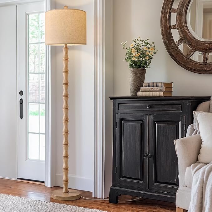 - 【Sturdy & Durable Resin Body】: Crafted from durable resin with a natural wood-look finish, this rustic floor lamps for living room combines retro design with long-lasting quality. A weighted base provides enhanced stability, keeping the lamp secure and preventing accidental tipping.