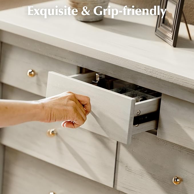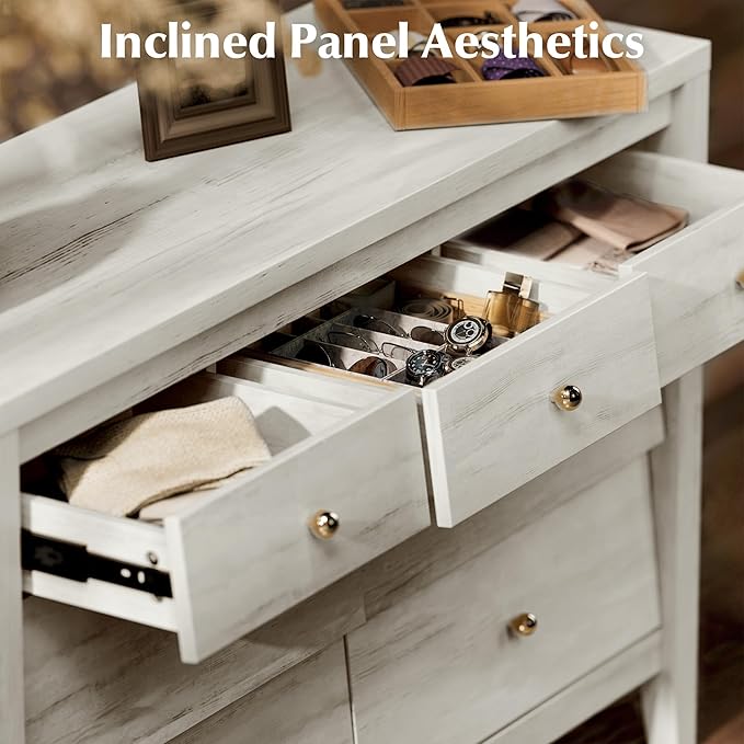 - Hierarchy Storage: Spacious top surface doubles both as a storage space and a creative embellishment hub. The tiered depths design ensures a stellar dresser storage experience. Achieve a superb synergy between exquisite style and practical utility