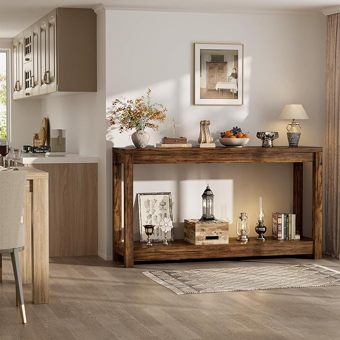 47" Farmhouse Wood Entryway Table Narrow Console Table with Storage Behind Couch Sofa Table with Shelves Entry Way Table with Open Storage, Easy Assembly, Rustic Brown