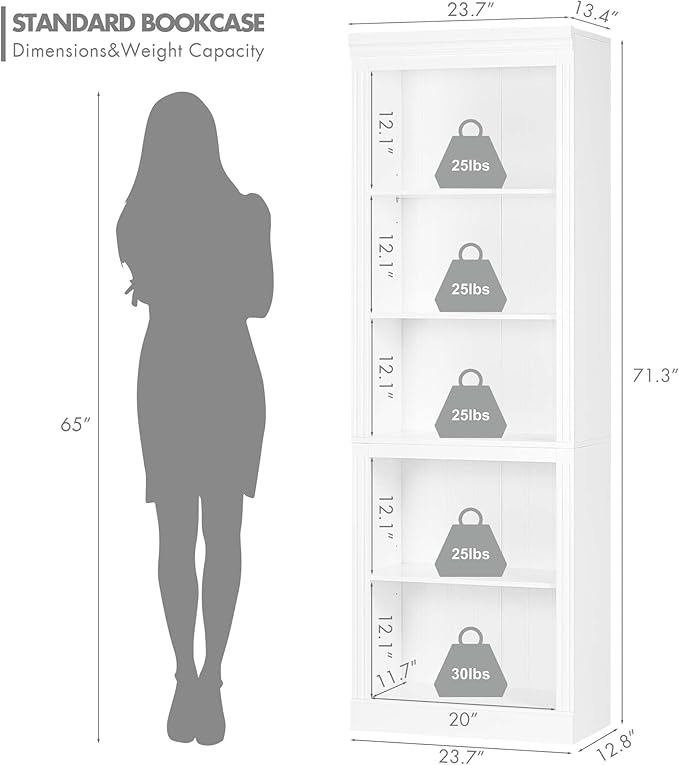 - Space-Saving Tall Bookshelf Design: Measuring 23.7"W x 13.4"D x 71.3"H, this tall bookcase features deeper shelves than most white bookshelves, offering ample room for large books, plants, collectibles, file folders, or baskets.