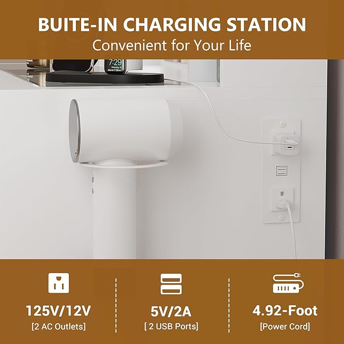 - 【VANITY WITH CHARGING STATION】White vanity with lighted mirror features the built-in power strip with 2 outlets and 2 USB ports, you can use eazily of curling irons, hair dryers, and phone charging. With a hair dryer rack on the right, so you don't worry again about turning off the lights and not being able to find hair tools.