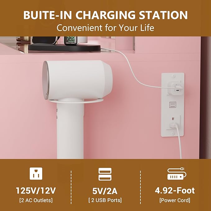 - 【VANITY WITH CHARGING STATION】White vanity with lighted mirror features the built-in power strip with 2 outlets and 2 USB ports, you can use eazily of curling irons, hair dryers, and phone charging. With a hair dryer rack on the right, so you don't worry again about turning off the lights and not being able to find hair tools.